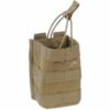 Kurze Magazintasche für zwei G36, AR15 Magazine, welche durch Bungee-Cord gesichert werden. – Molle-Reverse-System – drei Molle-Streifen auf der Front – benötigt zwei Molle-Schlaufen – Material: 100% Polyamid Cordura 700 den – Maße: 13 x 8 x 10 cm